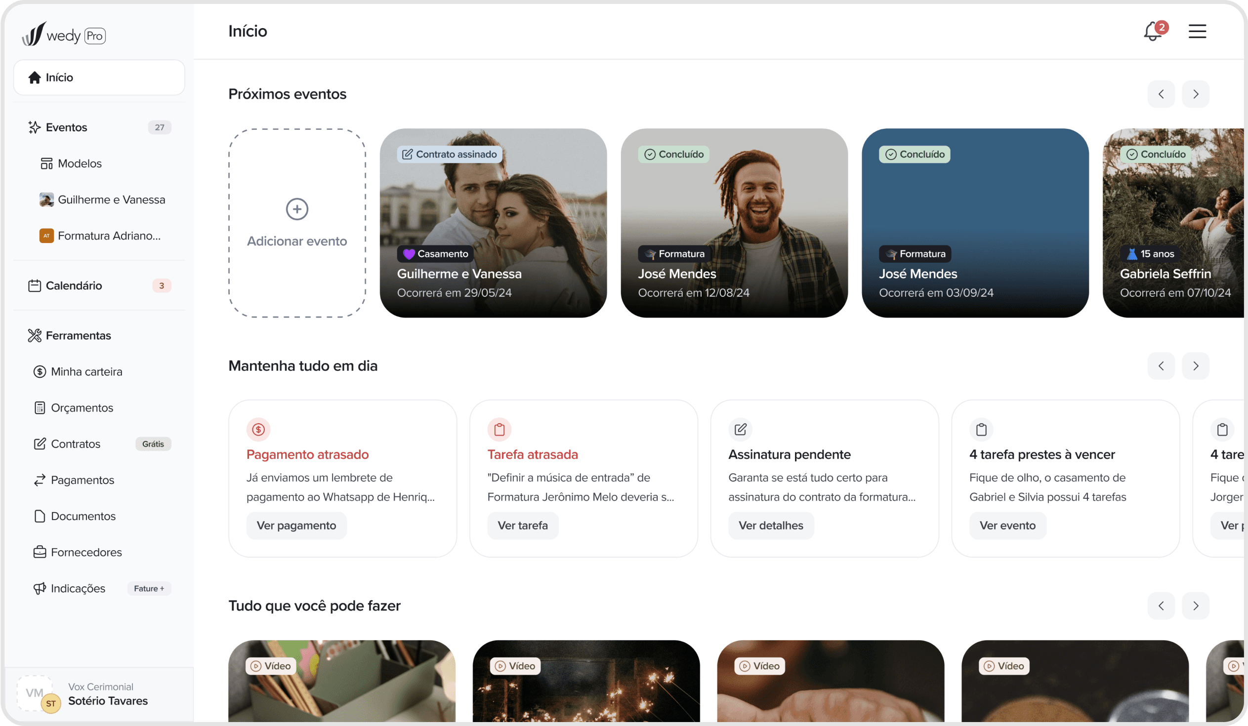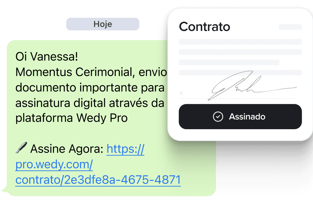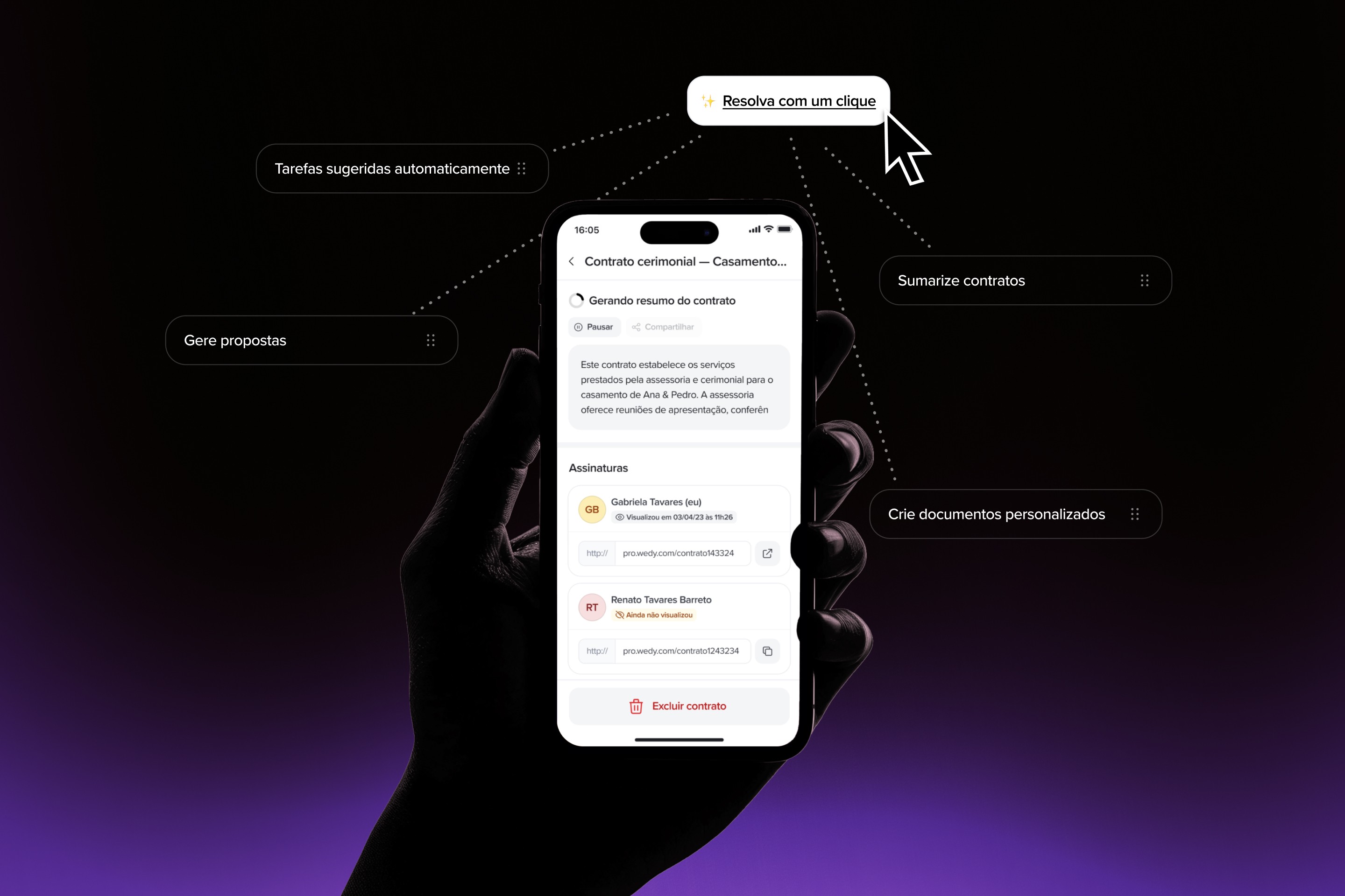 Com a Wedy Pro você gerencia seus eventos, faz envios automatizados de RSVP pelo WhatsApp, assina contratos digitalmente e controla o fluxo de pagamentos