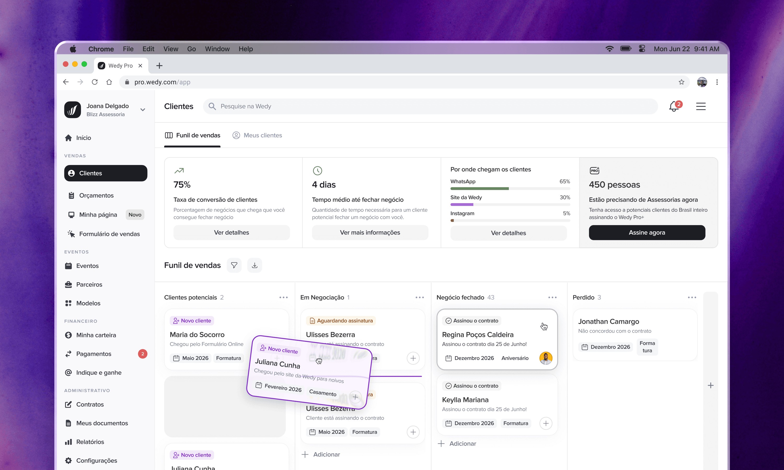 A Wedy tem sido muito bem aceita por meus noivos. É fácil de utilizar, tem muitas funções que outros sites acabam não oferecendo. E para nós como assessoria, tem uma grande vantagem, pois temos o acesso dos sites de nossos clientes através da Wedy Pro. É fantástico, super recomendo!